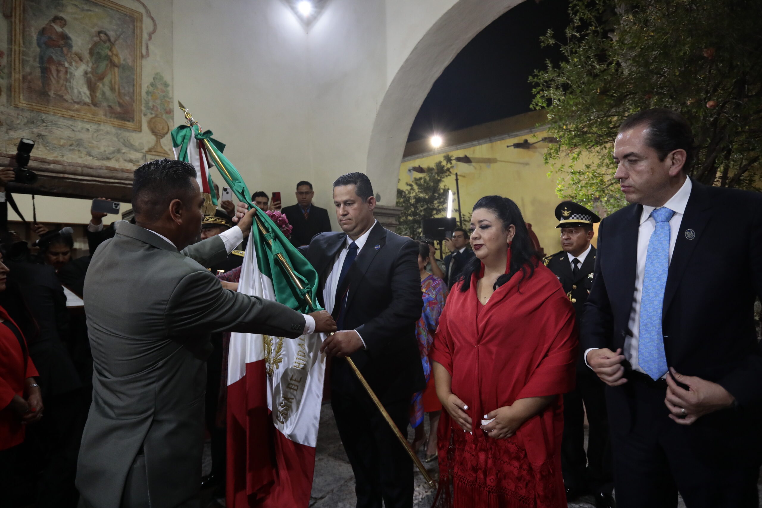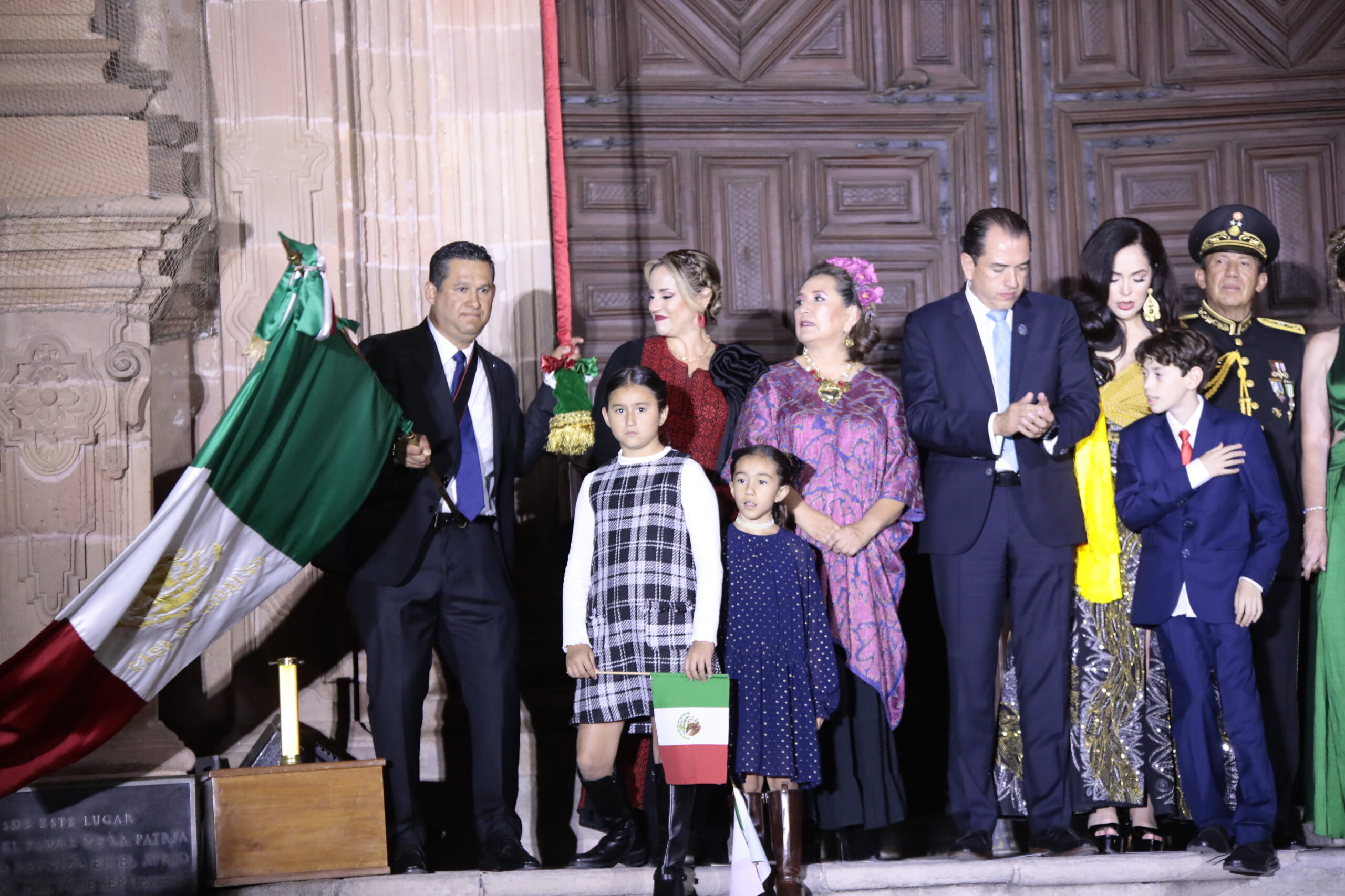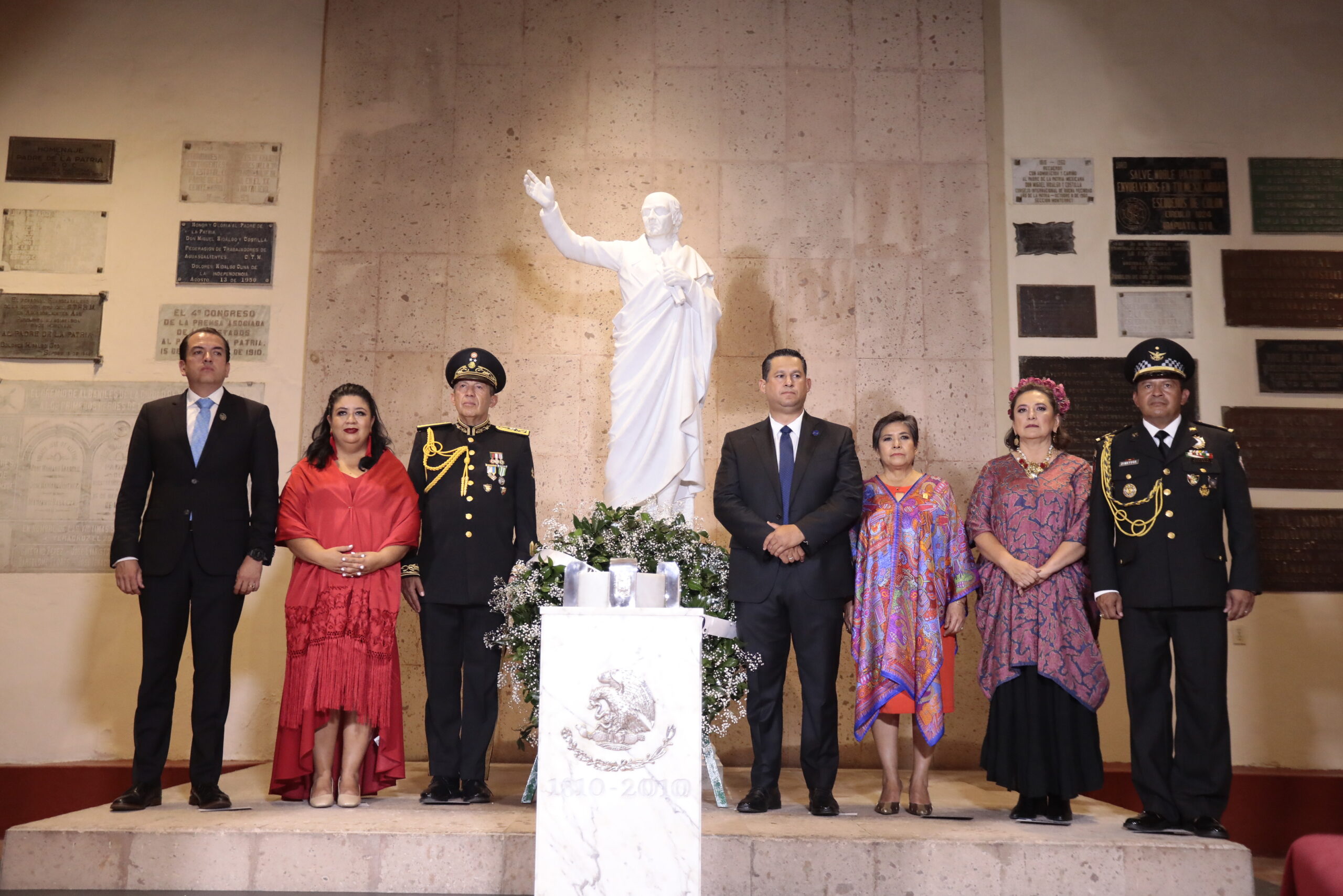 El Gobernador y los invitados especiales formaron una Escolta en el pórtico de la casa de visitas, integrada por los Poderes, mandos Militares, Presidente Municipal y la Senadora de la República, Xóchitl Gálvez Ruíz; para posteriormente partir hacia el Museo Casa Hidalgo, donde hicieron una Guardia de Honor y colocarán una Ofrenda Floral.