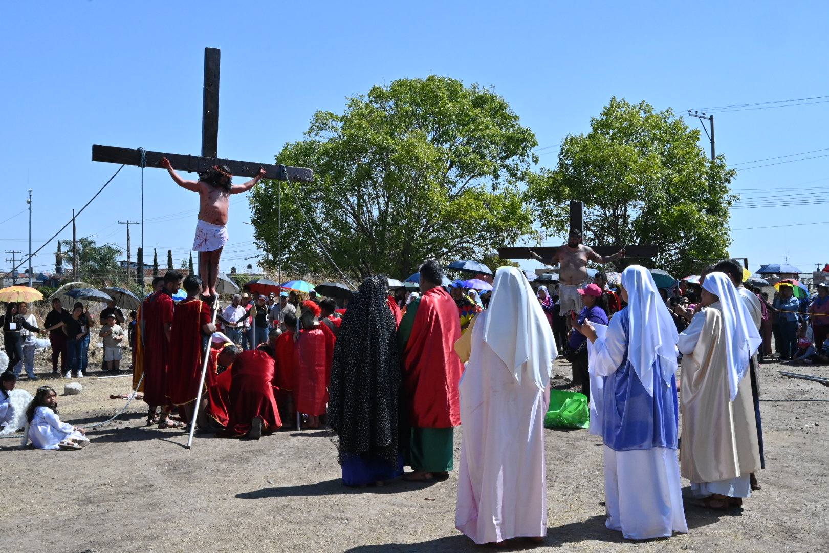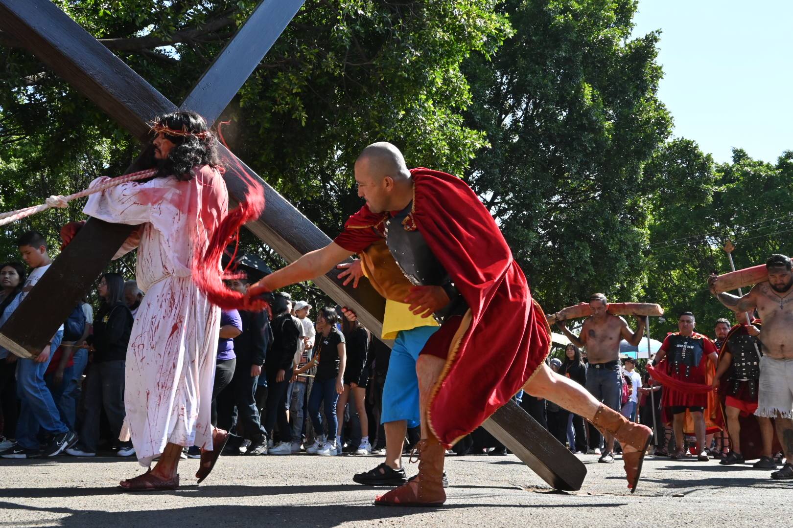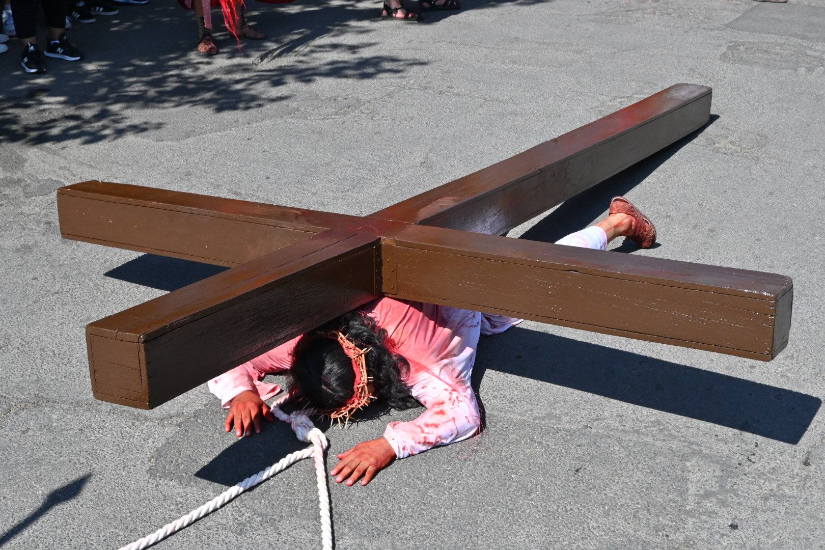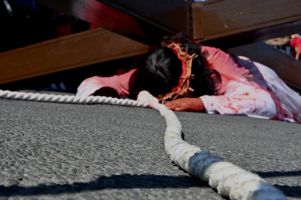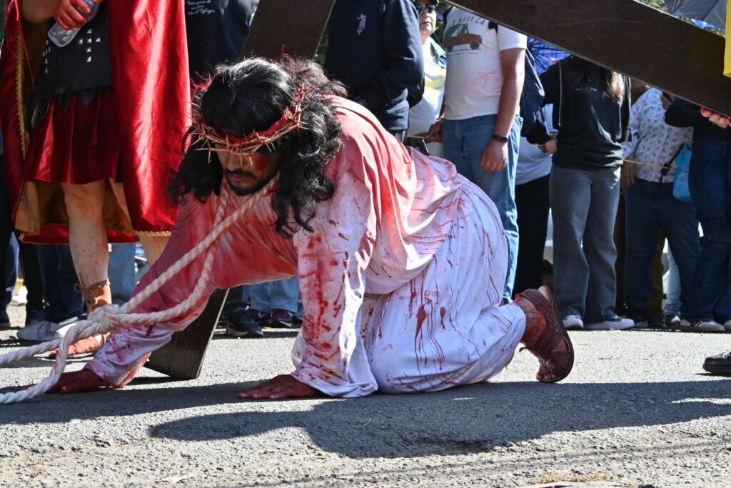 Feligreses y autoridades de la parroquia de nuestra señora del Refugio, escenificaron el pasaje del nuevo testamento, en dónde Jesucristo es llevado a la inmolación en viernes santo, y Cristo cargando la cruz, recorrió el camino que lo llevaría al martirio, mientras era azotado por los soldados Romanos.