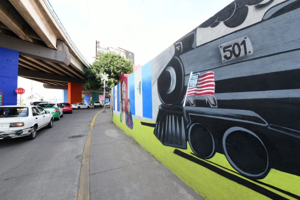 Irapuato, Gto. 07 de octubre del 2023.- Para mejorar la imagen urbana en la zona de paso de personas migrantes y apoyar el talento de artistas irapuatenses, el Instituto Municipal de la Juventud de Irapuato (Imjuvi) apoyó la creación de un mural diseñado por jóvenes de la ciudad.