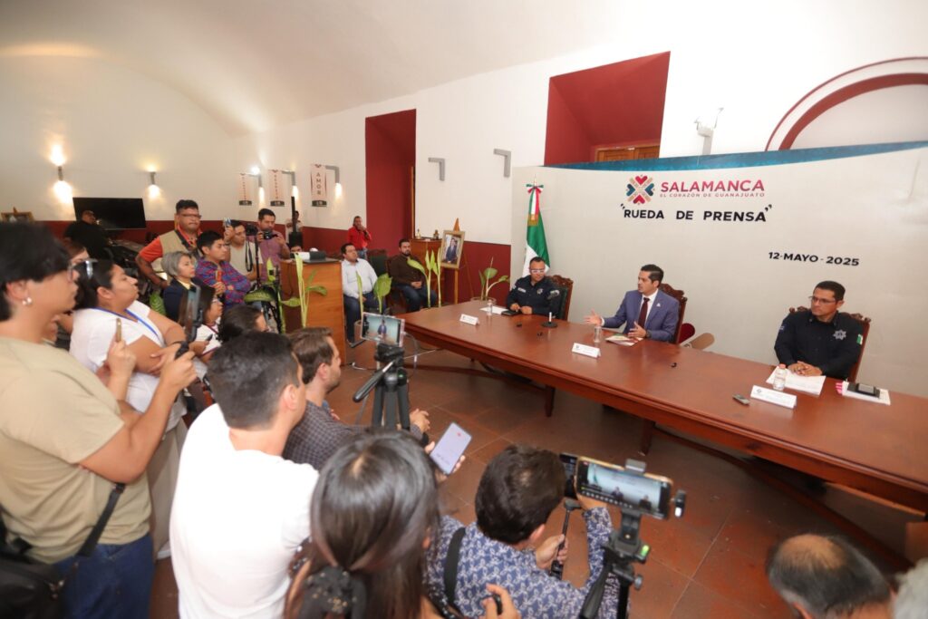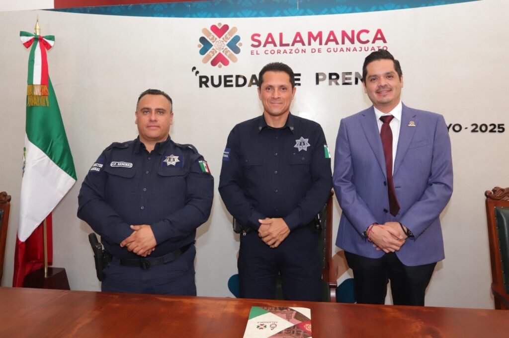 Salamanca, Gto. 12 de mayo del 2025. Como parte de su compromiso con la seguridad y el bienestar de la ciudadanía, el presidente César Prieto presentó en rueda de prensa al nuevo Comisario de Seguridad Pública de Salamanca, Pedro Alberto Cortés Zavala, quien desempeñará un papel fundamental en materia de mantenimiento del orden público, supervisión de oficiales, implementación de políticas de seguridad, gestión de recursos y colaboración con otras dependencias.