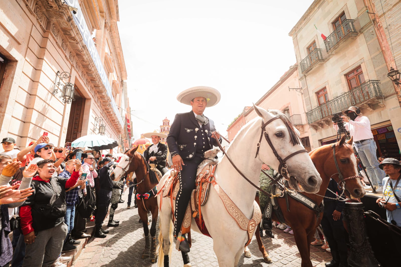 Después, por primera vez, el Gobernador se integró de nueva cuenta al desfile, a bordo de su caballo y con el atuendo típico de charro, para cabalgar hasta la Alhóndiga de Granaditas y encabezar la ceremonia del Fuego Simbólico.