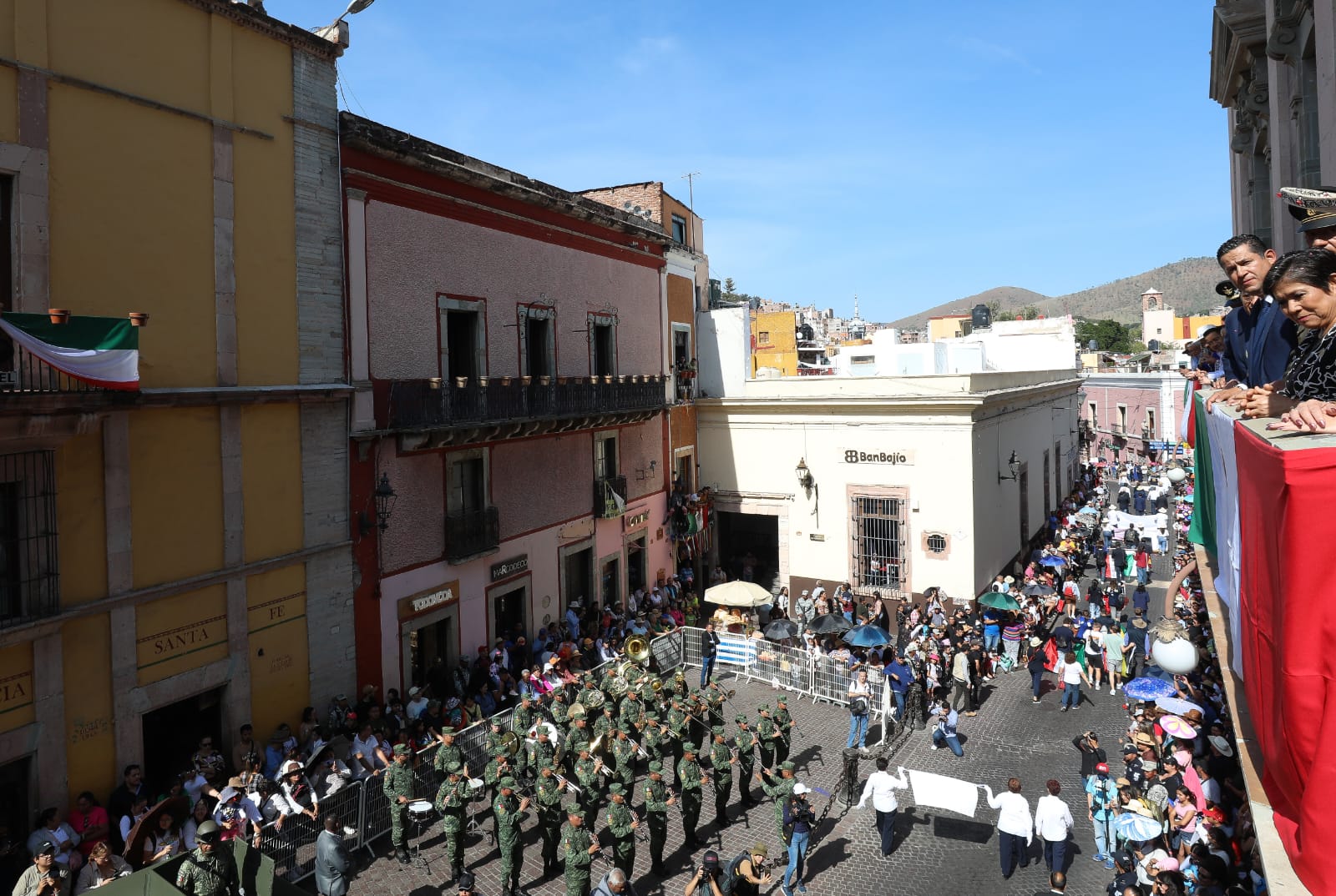 El Mandatario Estatal encabezó los Honores a la Bandera en el Jardín Embajadoras y a su paso por las calles de Guanajuato saludó a los asistentes.