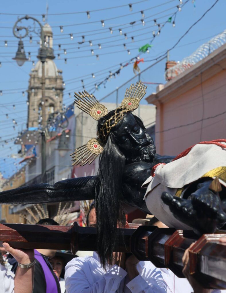 El Cristo Negro es una figura elaborada por medio de una técnica prehispánica de arte sacro conocida como tatzingueni o caña de maíz. Originalmente era blanca y, por su rostro dirigido hacia el cielo en actitud suplicante, se le llamaba Señor de los Agonizantes. Su leyenda se remonta a 466 años en el pasado, cuando un grupo de devotos otomíes, encabezado por Juan Cardona, salió de Jilotepec, en el Estado de México, en busca del sitio que la imagen encomendó en un sueño: “(…) donde veas que mi cruz está incrustada en el piso sin intervención de nadie, es porque allí será mi deseo quedarme”.